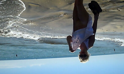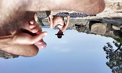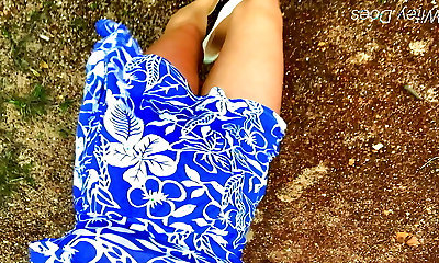 Pussy getting off beautiful brunette MILF on wild beach by lake outdoors. Nude beach. Fingering moist pussy orgasm bust